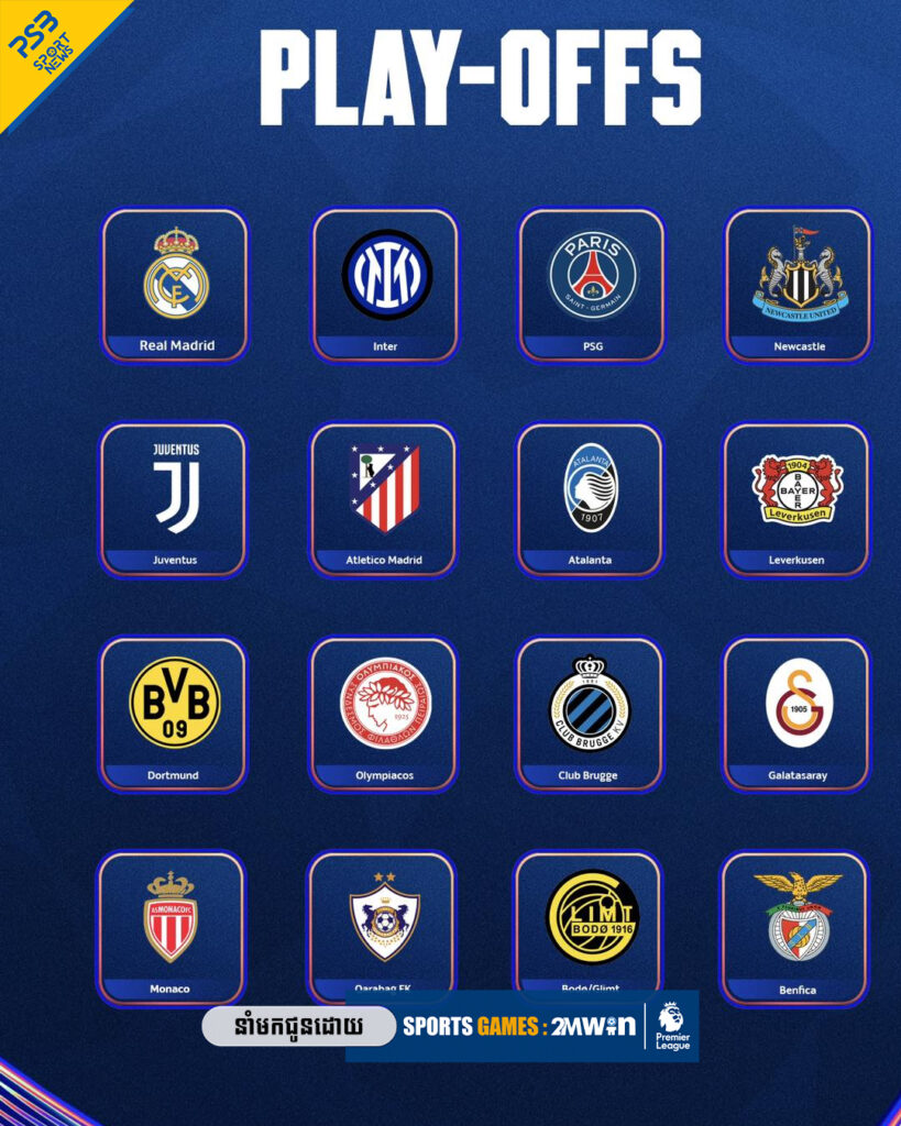 ក-Knockout Play-off(Seeded Teams) ក្រុមចំណាត់ថ្នាក់ល្អ(លេខរៀងទី៩-១៦) គឺReal Madrid, Inter Milan, Paris Saint-Germain, Newcastle , Juventus, Atlético Madrid, Atalanta, Leverkusen