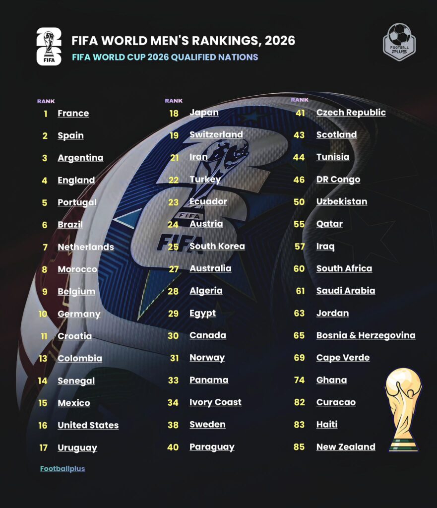 (English) ក្រុមជម្រើសជាតិបារាំង បានឆកយកតំណែងពី អេស្ប៉ាញ ឈរចំណាត់ថ្នាក់លេខ១ ក្នុងតារាងចំណាត់ថ្នាក់ពិភពលោករបស់ FIFA ជាលើកដំបូងចាប់តាំងពីខែកញ្ញា ឆ្នាំ ២០១៨។ អេស្ប៉ាញបានកាន់កាប់ចំណាត់ថ្នាក់កំពូលចាប់តាំងពីខែកញ្ញា ឆ្នាំ២០២៥ ប៉ុន្តែកំពុងទទួលបានលទ្ធផលស្មើដោយគ្មានគ្រាប់បាល់នៅថ្ងៃអង្គារទល់នឹងអេហ្ស៊ីប។