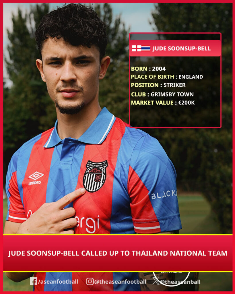 (English) កីទ្បាករកូនកាត់ថៃ-អង់គ្លេស Jude Soonsup-Bell បានទទួលយកជាផ្លូវការនូវការកោះហៅឱ្យតំណាងក្រុមជម្រើសជាតិថៃ សម្រាប់ការប្រកួត FIFA Matchday ខែវិច្ឆិកា ឆ្នាំ២០២៥ ខាងមុខនេះ។ Jude Soonsup-Bell ដែលមានវ័យ ២១ ឆ្នាំរូបនេះគឺមានឪពុកជនជាតិអង់គ្លេស និងម្តាយជាជនជាតិថៃ មានសិទ្ធិលេងតំណាងឱ្យក្រុមជម្រើសជាតិអង់គ្លេស និងថៃ ប៉ុន្តែរូបគេជ្រើសរើសលេងឱ្យក្រុមជម្រើសជាតិថៃ។