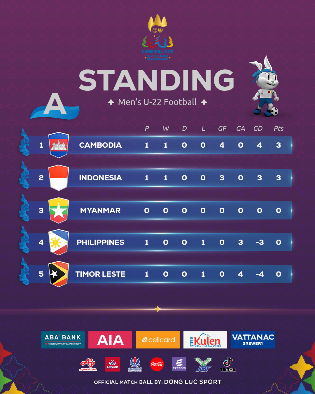 ដោយសារជ័យជម្នះខាងលើ ក្រុមជម្រើសជាតិ U-22 កម្ពុជា ពេលនេះកំពុងឈរនៅលើកំពូលតារាងនៃការប្រកួតកីឡាស៊ីហ្គេម ឆ្នាំ២០២៣ ពូល A ជាមួយនឹងការប្រមូលបាន ៣ ពិន្ទុពីការប្រកួតតែមួយ។ ជាមួយគ្នានេះ ចំណាត់ថ្នាក់លេខ២ គឺត្រូវបានកាន់កាប់ដោយក្រុម U-22 ឥណ្ឌូនេស៊ី ដែលប្រមូលបាន៣ពិន្ទុផង​ដែរ បន្ទាប់ពីយកឈ្នះហ្វីលីពីន ៣-០ ក្នុងការប្រកួតបើកឆាករបស់ខ្លួន។