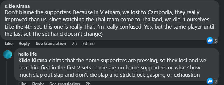 ហើយថៃនឹងត្រូវប៉ះជាមួយវៀតណាមដណ្ដើមមេដាយសំរឹទ្ធ។ និយាយក្នុងស្ថានភាពដែលក្រុមជម្រើសជាតិថៃរងបរាជ័យក្រុមថ្វីដៃកម្ពុជា អ្នកគាំទ្រថៃជាច្រើនលើសលប់បានបញ្ចេញមតិយោបល់យល់ស្រប និងទទួលស្គាល់ពីសមត្ថភាពក្រុមជម្រើសជាតិបាល់ទះកម្ពុជាថា៖