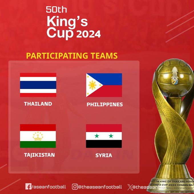 ដោយឡែក សមាគមកីឡាបាល់ទាត់ថៃក៏បានប្រកាសពីការប្រកួតពានរង្វាន់ King’s Cup 2024 របស់ខ្លួនផងដែរ។ 2024 King Cup នឹងធ្វើឡើងនៅប្រទេសថៃក្នុងខែតុលា ហើយក្រុមទាំង៤ដែលចូលរួមត្រូវបានគេរំពឹងថានឹងរួមមាន៖ ថៃ (១០០), តាជីគីស្ថាន (102), ស៊ីរី (93) និងជម្រើសជាតិ ហ្វីលីពីន (147)៕