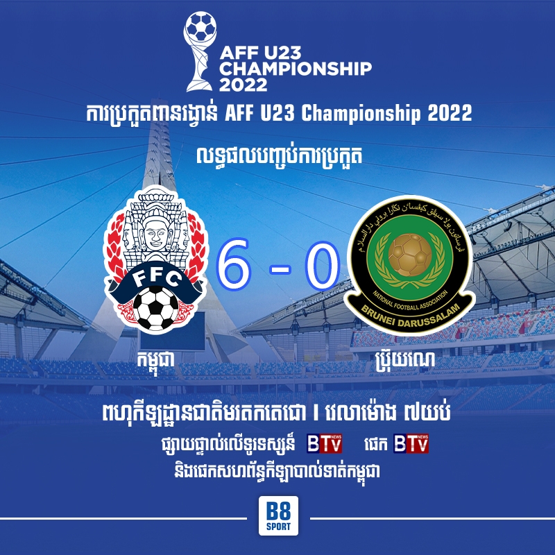 ក្រុមបាល់ទាត់ជម្រើសជាតិកម្ពុជាវ័យក្រោម២៣ឆ្នាំបានយកឈ្នះក្រុមជម្រើសជាតិប្រ៊ុយណេ វ័យក្រោម២៣ឆ្នាំក្នុងលទ្ធផល៦ទល់០នាការប្រកួតបើកឆាកក្នុងពូល A នៃពានរង្វាន់ AFF U23 Championship 2022 នៅពហុកីឡដ្ឋានមរតកតេជោ នាទីក្រុងភ្នំពេញ។