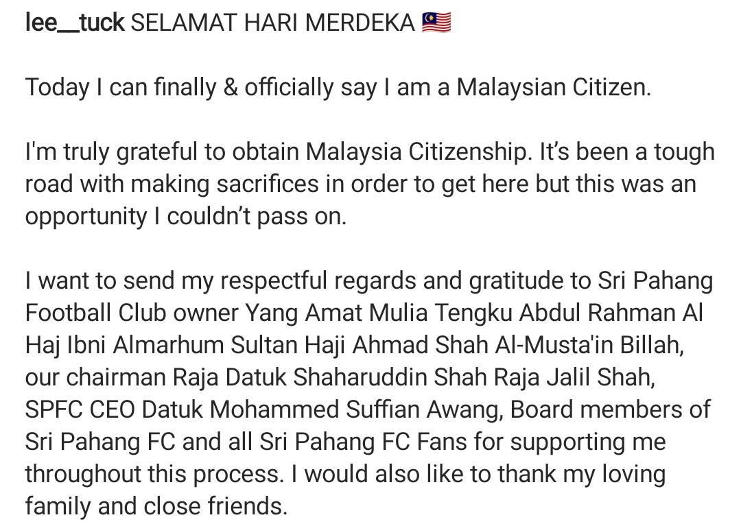 និន្នាការនៃកីឡាករបាល់ទាត់ដែលចូលសញ្ជាតិហាក់ដូចជាដើរទន្ទឹមគ្នាជាមួយនឹងប្រទេសអាស៊ីអាគ្នេយ៍ក្នុងរយៈពេលប៉ុន្មានឆ្នាំកន្លងមកនេះ។ កាលពីយប់មិញ ខ្សែប្រយុទ្ធសញ្ជាតិអង់គ្លេស Lee Tuck បានក្លាយជាកីឡាករចុងក្រោយគេក្នុងបញ្ជីនោះ ខណៈដែលកីឡាករវ័យ 34 ឆ្នាំបានប្រកាសនៅលើ Instagram របស់គាត់អំពីដំណឹងនៃការក្លាយជាពលរដ្ឋម៉ាឡេស៊ីផ្លូវការ។